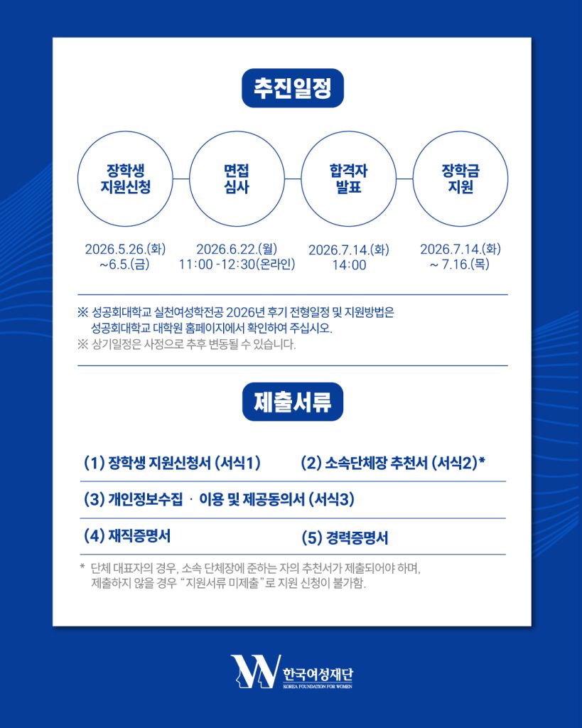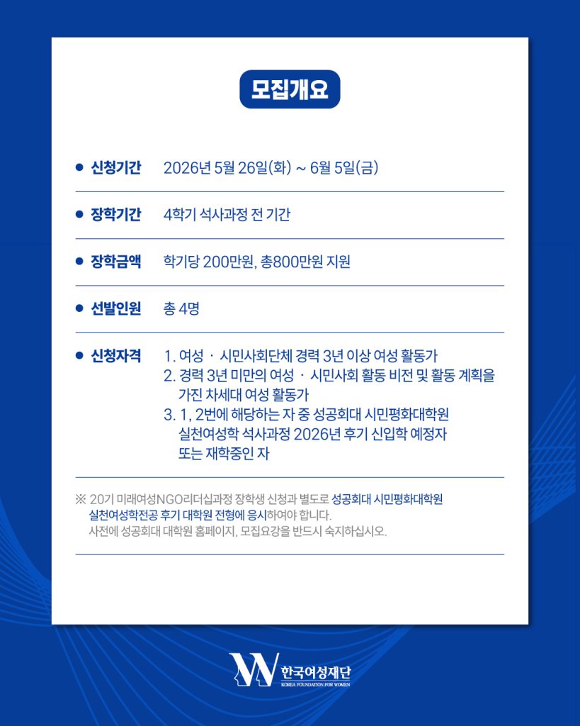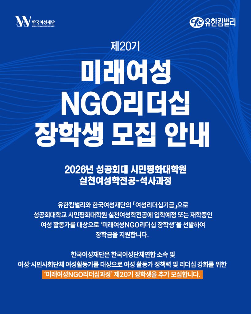 #한국여성재단 #유한킴벌리 #미래여성NGO리더십과정 #장학생모집 #여성활동가 #실천여성학 #석사과정 #장학금 #성공회대학교 #여성리더십