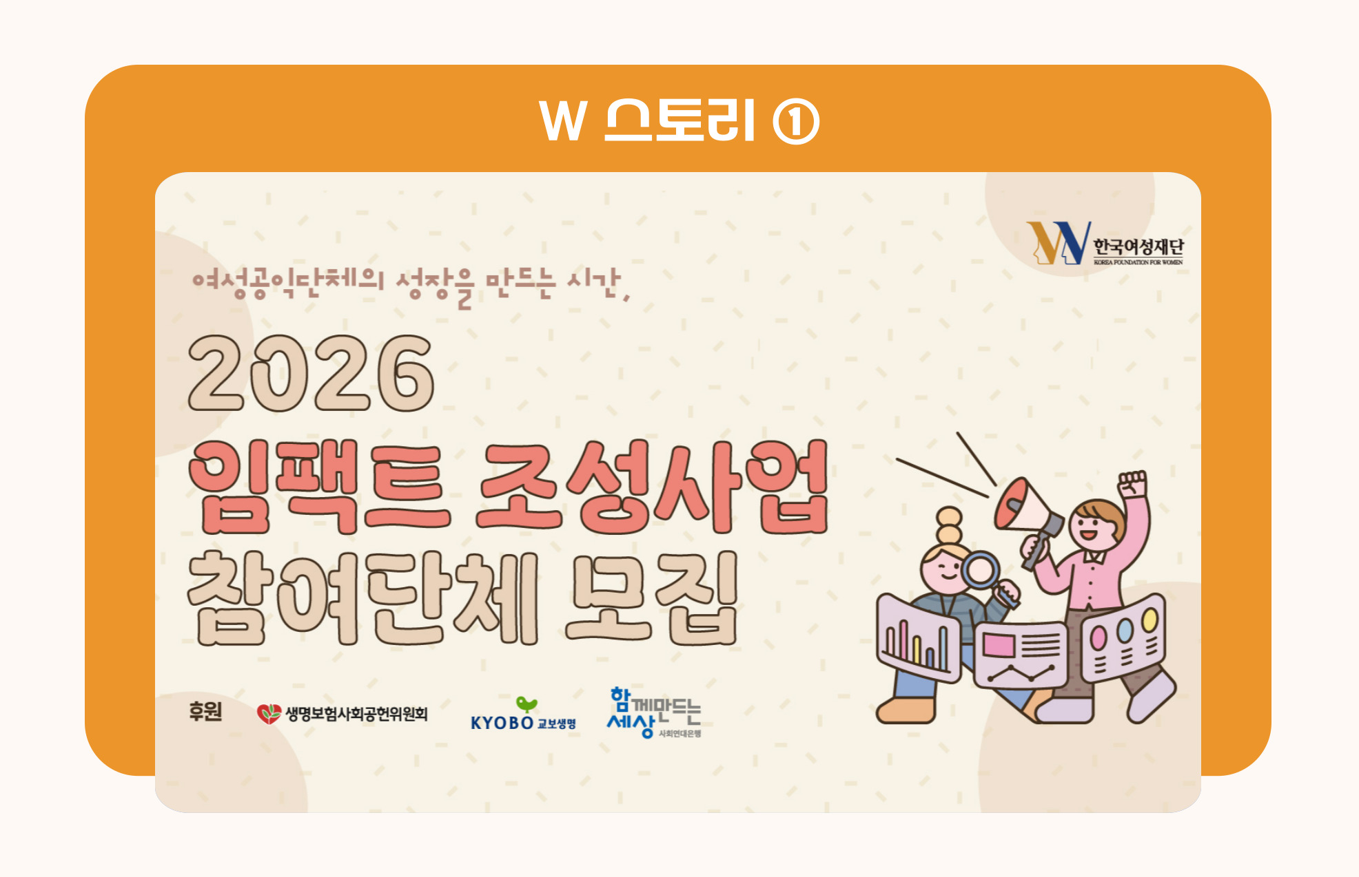 한국여성재단은 여성공익단체의 지속가능한 성장을 돕기 위해 <2026 임팩트 조성사업> 참여단체를 모집합니다. 우리 단체의 활동이 만들어낸 변화와 성과를 측정하고 싶지만 어디서부터 시작해야 할지 막막한 단체들을 위해, 이번 사업은 활동의 핵심 지표를 함께 찾고 맞춤형 자문과 워크숍, 결과보고서 작성까지 단계별로 지원합니다. 우리 단체의 활동을 더 분명하게 설명하고 변화의 의미를 더 널리 전하고 싶다면, 이번 공모에 많은 관심 부탁드립니다. |