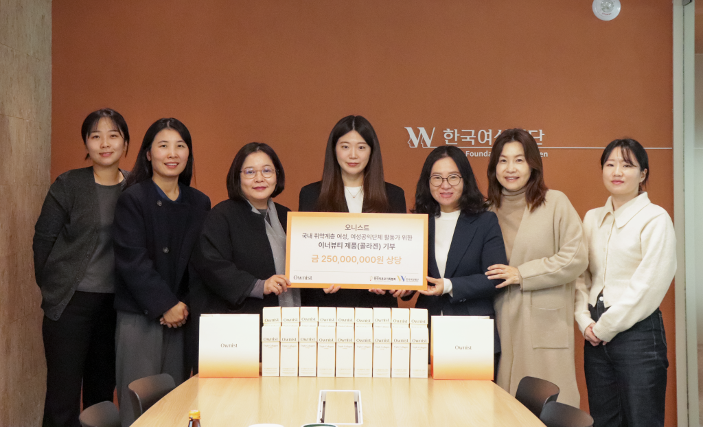 대상㈜ 고객지원본부장 주홍 전무(좌)와 한국여성재단 조형 이사장(우)의 기부전달