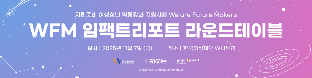<We are Future Makers(이하 WFM)>는 보호종료 후 자립을 준비하는 여성청년들에게 자립을 보조하는 지원금과 역량강화 교육 프로그램, 그리고 네트워킹의 기회를 지원하는 프로그램입니다.💫
