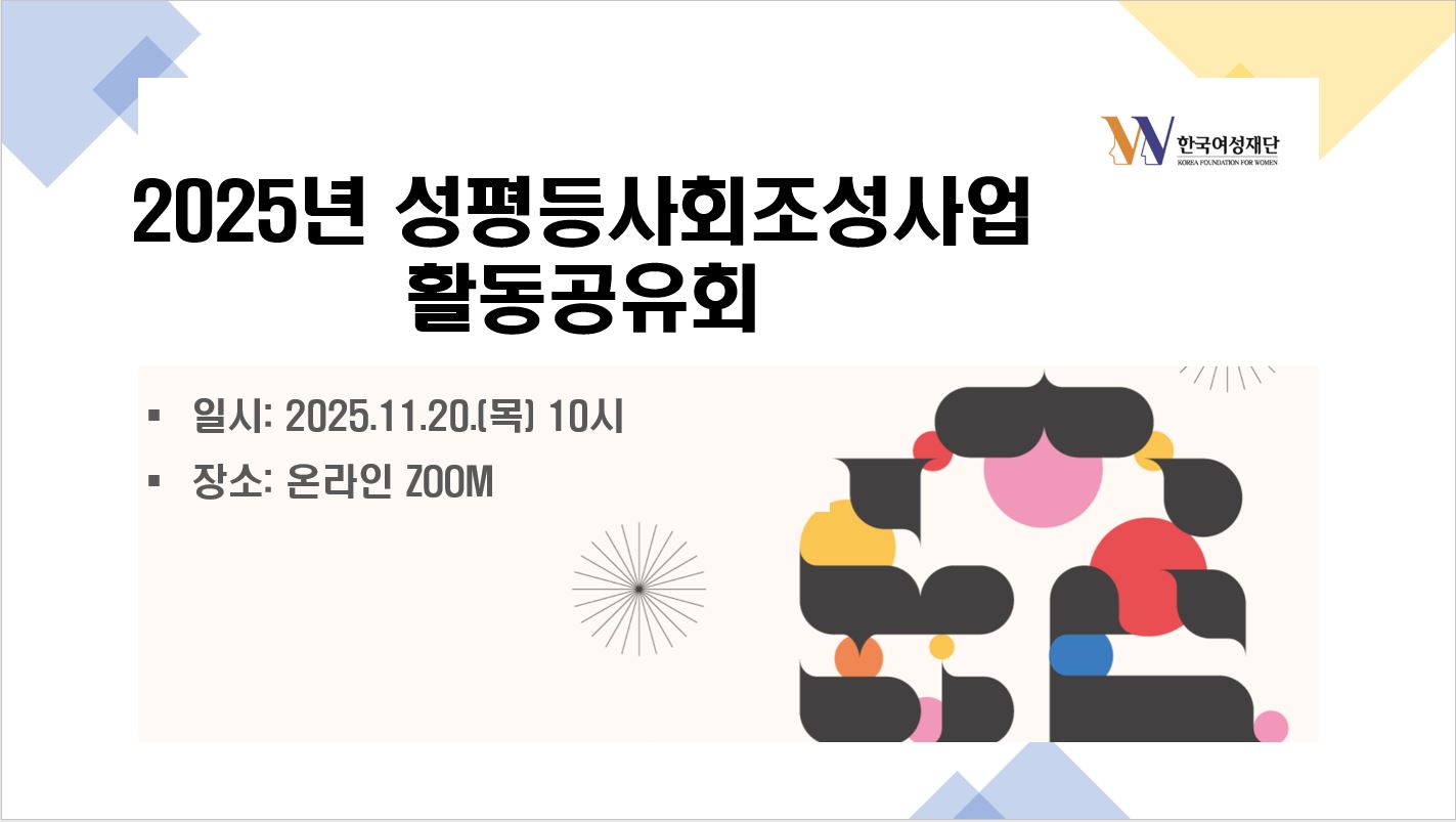 2025년 11월 20일에 개최된 성평등사회조성사업 활동공유회는 한 해 동안 각자의 자리에서 묵묵히 성평등을 위해 힘써온 9개 단체의 이야기가 모이면서 더 따뜻하고 단단한 시간이 되었습니다.
