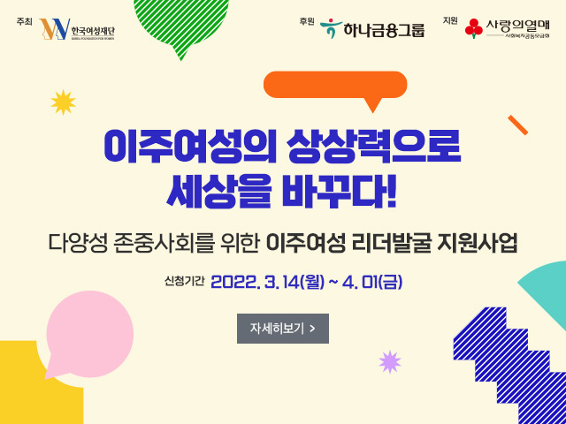 [공모] 2022년 이주여성 리더발굴 지원사업 공모(4/1까지) [공모] 2022년 이주여성 리더발굴 지원사업 공모(4/1까지) 2022.03.15 <저작권자© 한국여성재단> 2022/03/15 16:04 첨부파일220315_이주여성리더발굴지원사업_모바일배너.jpg 목록